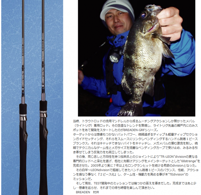 その後、同じ志しと方向性を持つ加来氏とのジョイントにより“TR-LEON”divisionの更なる専門的ロッドへと深化を遂げ、他社に先駆けアジングをメインターゲットとした“68strange”を完成させた。2005年より実に7年以上もロングランヒットを続ける奇跡のdivisionとなった。