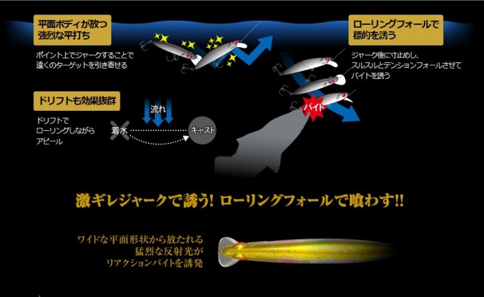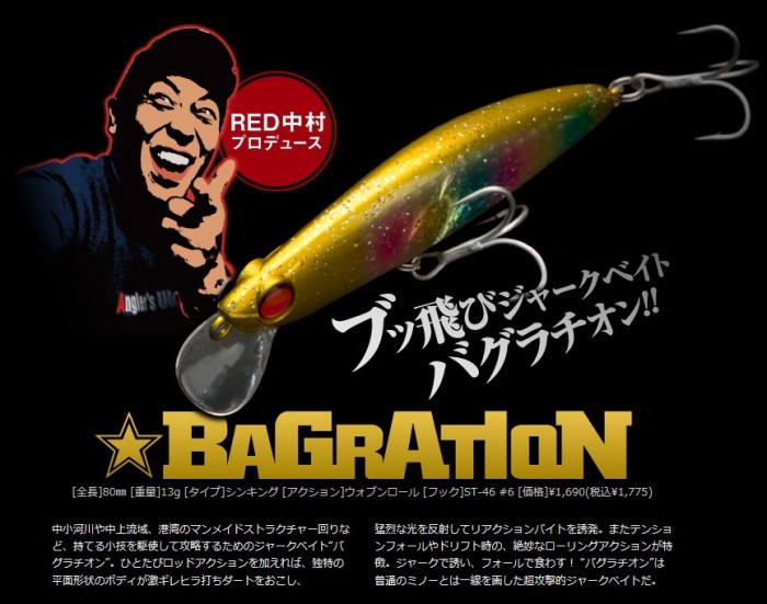 中小河川や中上流域、港湾のマンメイドストラクチャー回りなど、持てる小技を駆使して攻略するためのジャークベイト“バグラチオン”。ひとたびロッドアクションを加えれば、独特の平面形状のボディが激ギレヒラ打ちダートをおこし、猛烈な光を反射してリアクションバイトを誘発。またテンションフォールやドリフト時の、絶妙なローリングアクションが特徴。ジャークで誘い、フォールで食わす! “バグラチオン”は普通のミノーとは一線を画した超攻撃的ジャークベイトだ。