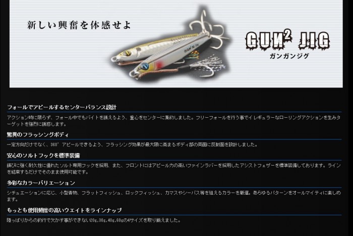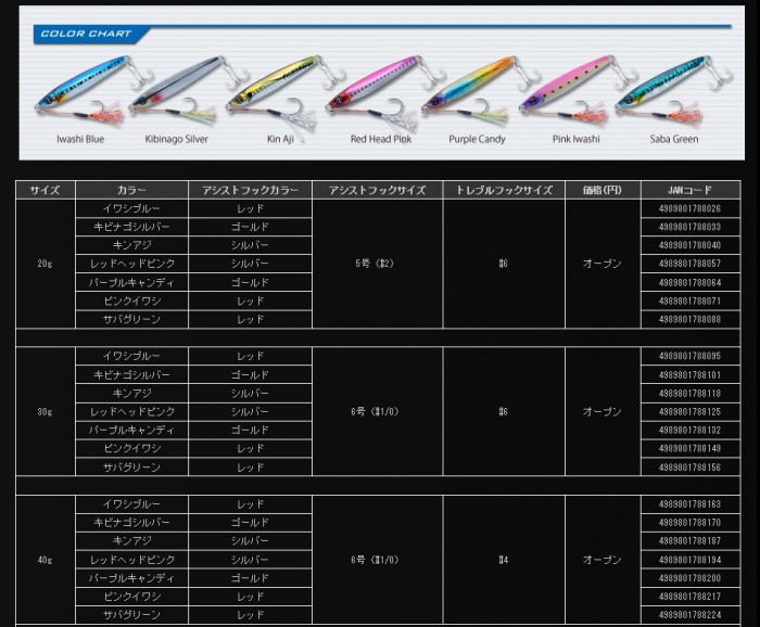 陸っぱりからの釣行で欠かす事ができない20g,30g,40g,60gの4サイズを取り揃えました。