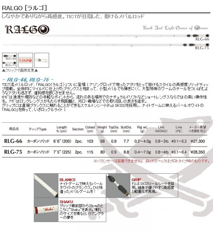 TICT流メバルロッド、「RALGO(ラルゴ)」ついに登場!アジングロッドで培ったアタリをとって掛けるスタイルの高感度ソリッドティップ搭載。 全体的にマイルドに仕上げたブランクスと相まって、小型メバルでも弾きにくく、大型特有のワームのテールをついばむようなアタリも逃さず、違和感を感じさせません。