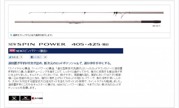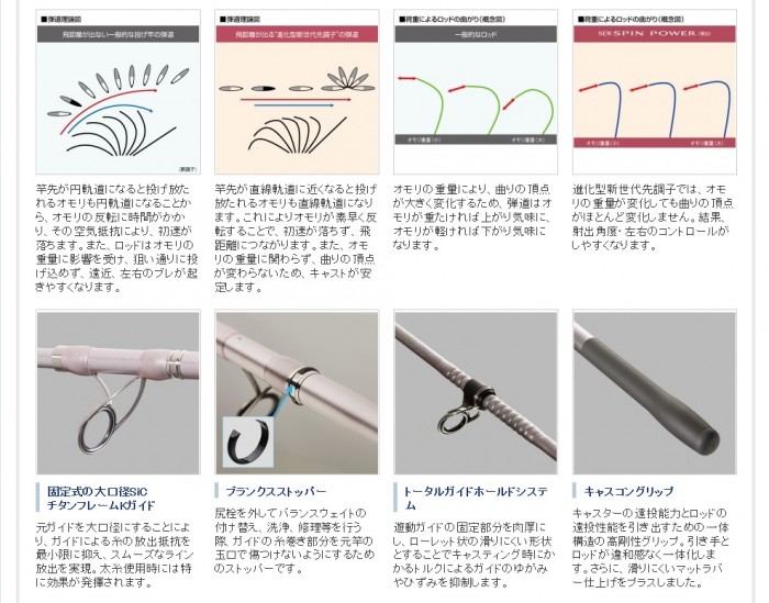 「スパイラルX」構造、「ハイパワーX」構造、「進化型新世代先調子」といったロッドテクノロジーに遠投置き竿釣りに適した徹底チューニングを施すことで、しっかりと曲がってから、強力に反発する振出投げ竿に仕上がりました。キャスティングにおいては、投げやすく、飛距離も狙え、実釣においてはアタリ感度・喰い込み性能の向上に加え、強引に巻き上げなくてもロッドの粘り&パワーで、魚の浮きが早い。しかも、太糸にも対応する固定式大口径元ガイドを含む「Kガイド」の採用で、ライントラブルも軽減しました。遠投置き竿にこだわるキャスターに捧げる、NEWスピンパワー〈振出〉、今までにない新次元のロッドポテンシャルを発揮します。